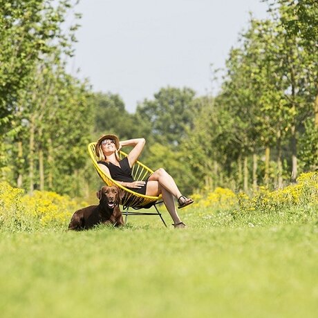 The Acapulco chair offers comfort with its ergonomic design and airy structure, thanks to its original dimensions. Perfect for indoor and outdoor use, it becomes even cozier with a sheepskin. Ideal for relaxation and a stylish addition.